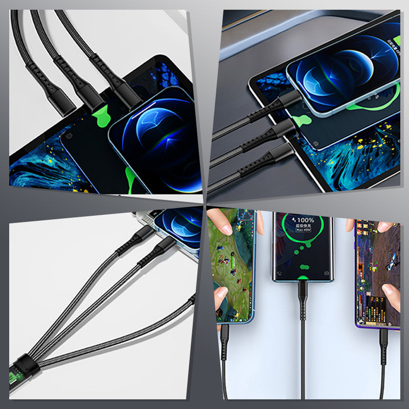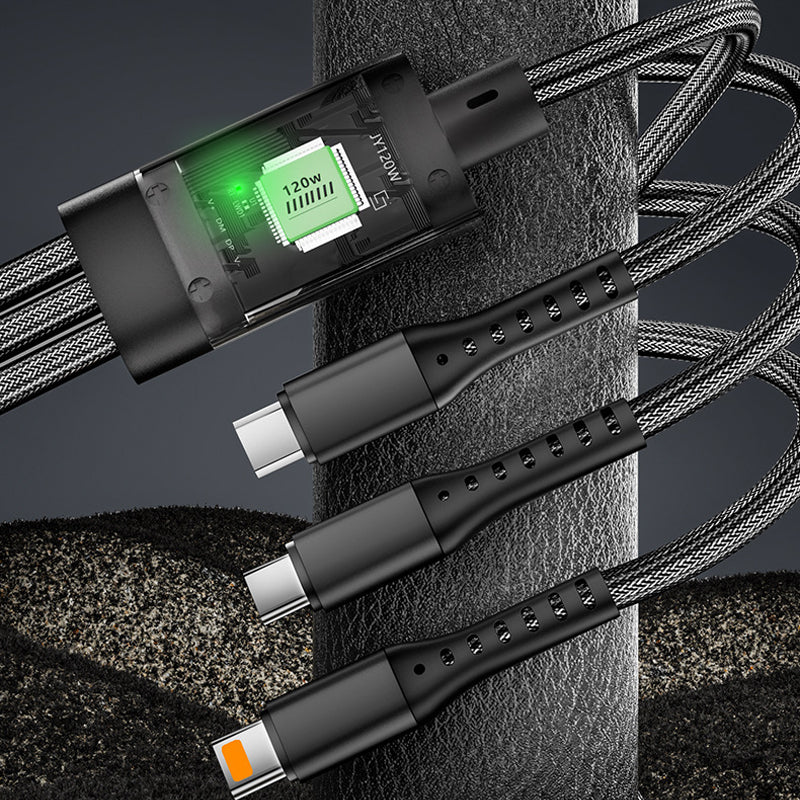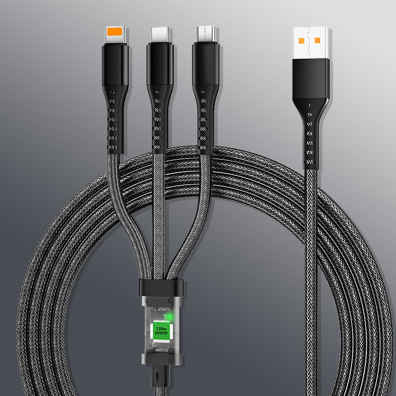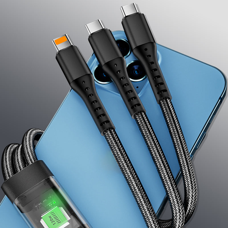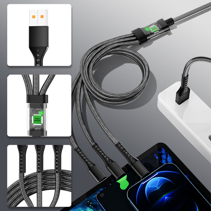 Ervaar het ultieme gemak met de 120W 3-in-1 Fast Charging Cable. Laad meerdere apparaten tegelijk op terwijl je geniet van stabiel opladen, een subtiel nachtelijk lichteffect en duurzaamheid die bestand is tegen meer dan 10.000 bochten.