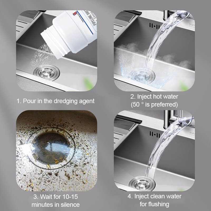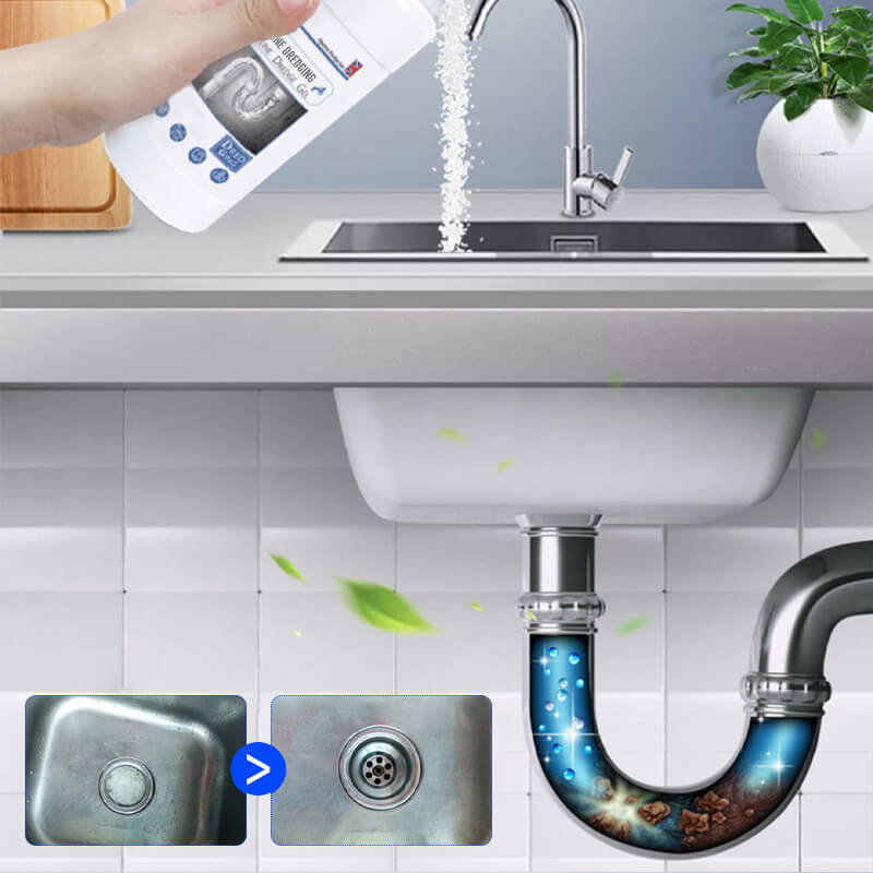 * Krachtige werking : Het lost snel verstoppingen in leidingen op, zoals haar, papier, zeepresten, groenten, fruit, voedselresten, vet en organisch materiaal. Het vloeibaar maakt vetten, oliën, pluisjes, papier, haar en ander organisch materiaal dat verstoppingen in de afvoer veroorzaakt.