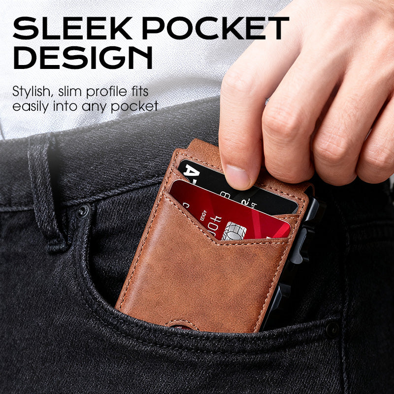 SNELLE KAARTUITWERPING : Voor uw belangrijkste kaartencollectie is de ingebouwde aluminium kaarthouder voorzien van een gemakkelijk toegankelijke knop aan de zijkant voor het snel en met één hand pakken van uw kaarten. Dit drukknopmechanisme zorgt voor een soepele, waaiervormige uitwerping, waardoor u direct de gewenste kaart kunt selecteren. Met dit systeem kunt u snel door de rijen bij de kassa en in beweging blijven.