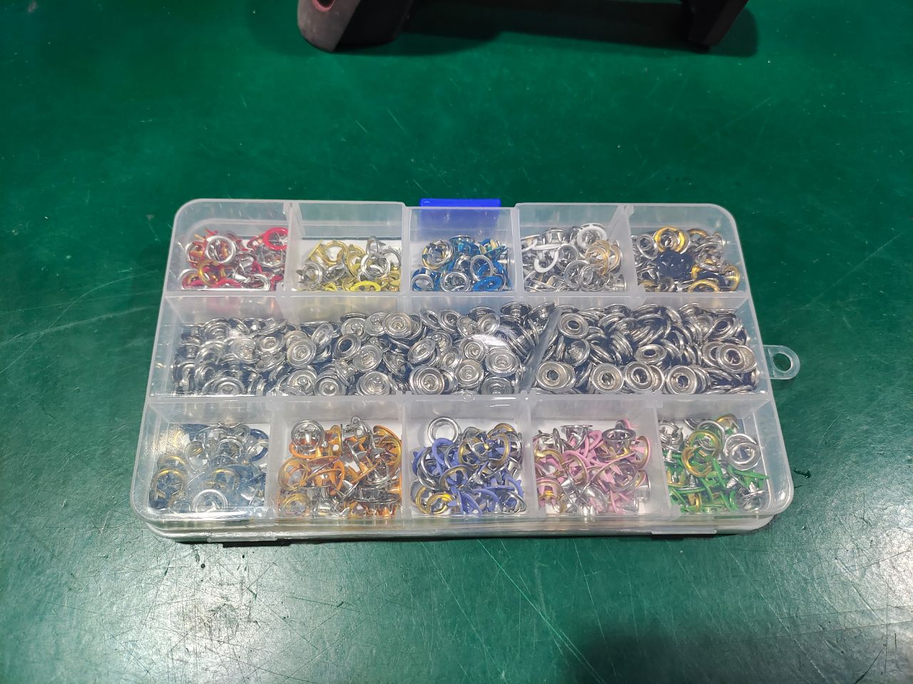 - Voor elke drukknoopset heb je 1 mannelijke drukknoop, 1 vrouwelijke drukknoop en 2 holle ringen nodig.