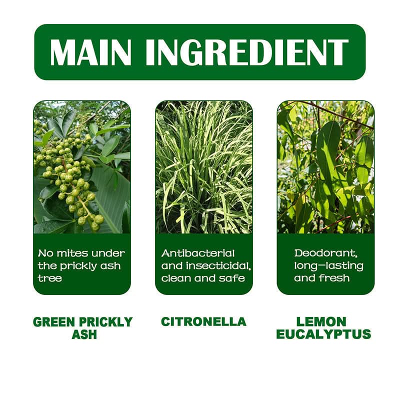 NATUURLIJKE INGREDIËNTEN - We halen de essentie uit planten waar mijten niet kunnen overleven. Citronella is toegevoegd vanwege zijn antibacteriële en insectendodende eigenschappen. Citroen-eucalyptus is toegevoegd voor een deodorant effect. De formule is veilig en niet giftig.